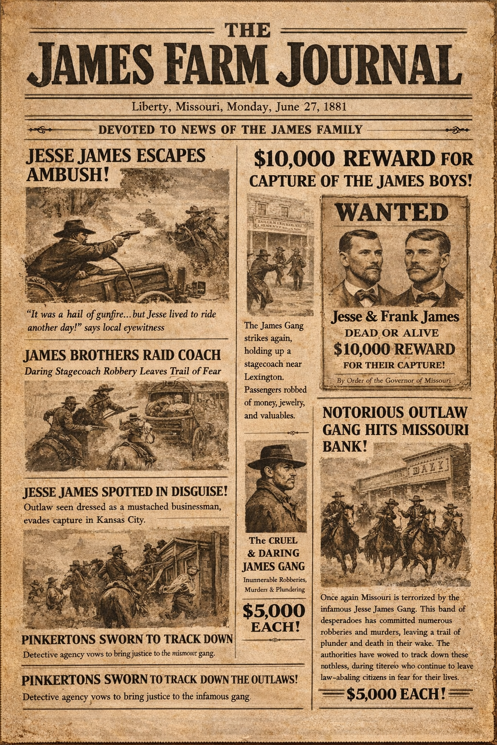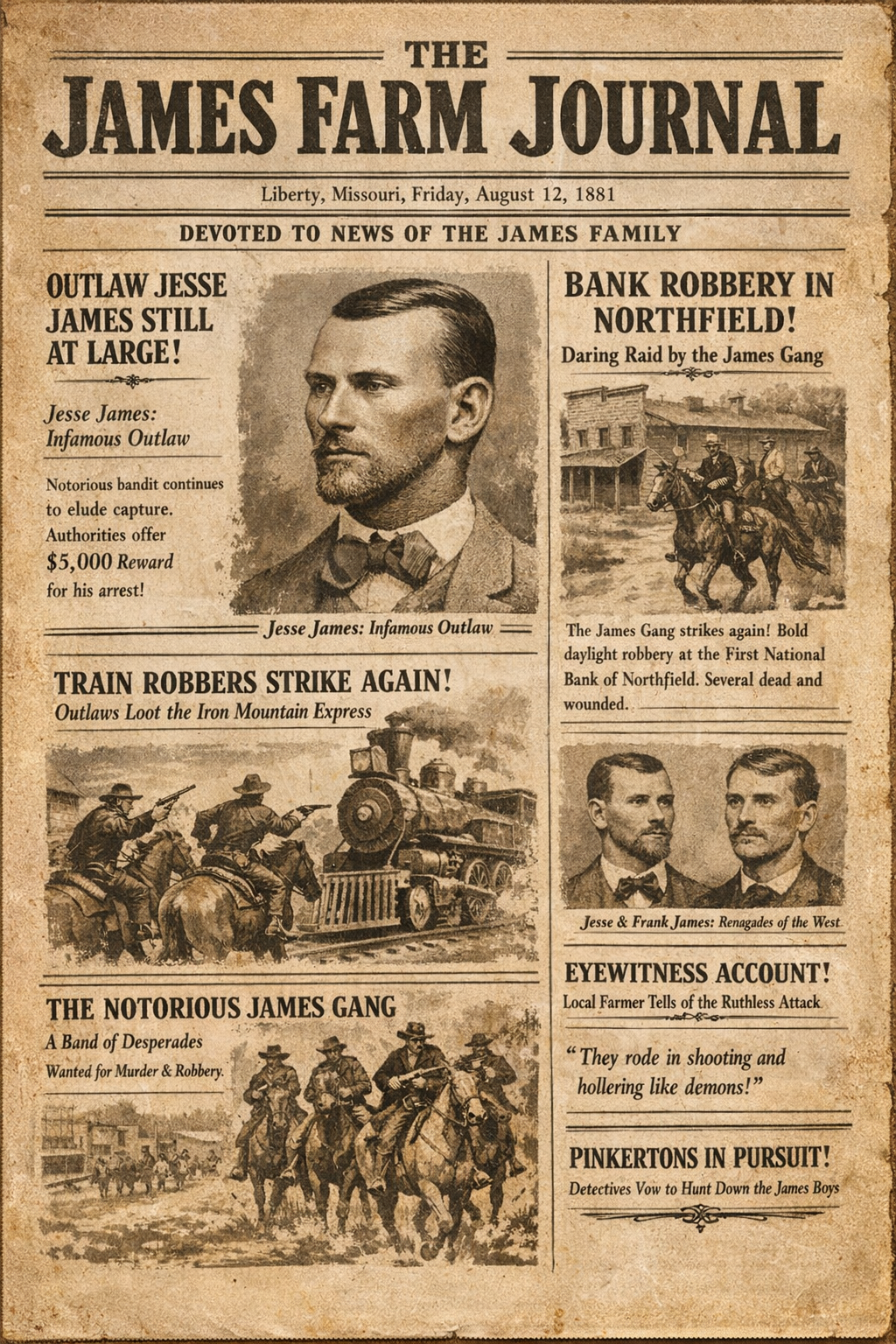 The James Farm Journal is the Friends of the James Farm newsletter, created to keep members and supporters in the loop on what’s happening at the Jesse James Birthplace and Museum in Kearney, Missouri. It covers Farm updates, preservation projects, fundraising efforts, upcoming events, and occasional deep dives into Jesse James history, blending practical news with storytelling to keep the Farm’s past and present connected.